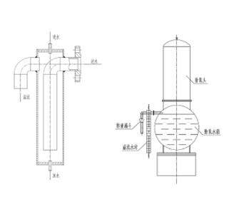 (3)當除氧器內的蒸汽過多而使除氧器內部壓力超過正常工作壓力時,多余的蒸汽可以通過溢流裝置排出,使除氧器泄壓,防止除氧器因超壓發生危險。溢流水封裝置結構及安裝圖如圖
